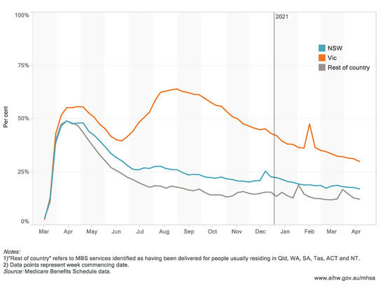 - In New South Wales, there was an initial steep increase in telehealth services between March and April 2020, followed by a gradual decline, consistent with the pattern for the country overall. Victoria showed a double peak in telehealth service use, consistent with the second wave in winter 2020, and a small but sharp spike in February 2021 at the time of a smaller outbreak in Victoria (Figure 4).