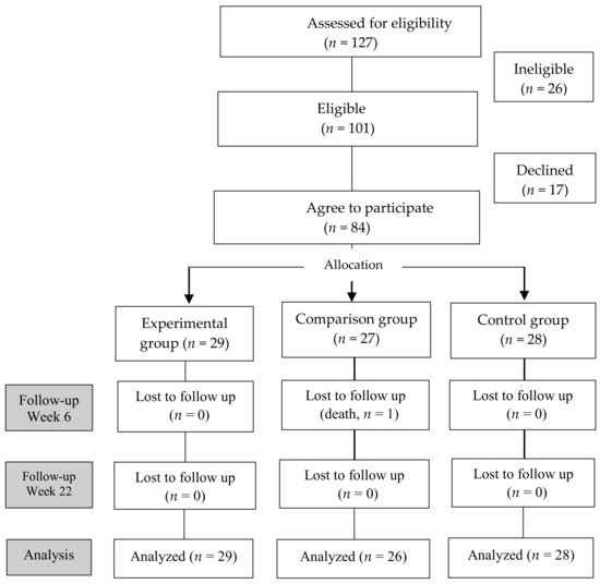 The sample size was determined using G*Power program Ver.3.1.The calculation was set for repeated measures analysis of variance with an effect size of 0.16, a significance level of 0.05, a power of 0.80, three groups, and three repetitions. We set the effect size with reference to a previous study that examined the effectiveness of acupressure on saliva flow rate and xerostomia in HD patients [3]. The minimum required sample size was 81; however, we decided to recruit 89 participants, considering a 10% withdrawal rate. From January to July 2019, the managers of the HD units forwarded lists of patients who met the selection criteria. A total of 127 patients showed interest in the study. Of those, 101 met the inclusion criteria and were invited to participate. After 84 patients consented to participate, 29, 27, and 28 patients were selected for the experimental, comparison, and control groups, respectively (Figure 1).