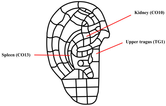 - Oleson, T. Auriculotherapy Manual: Chinese and Western Systems of Ear Acupuncture, 4th ed.; Churchill Livingstone Elsevier: Edinburgh, UK, 2014. [Google Scholar]