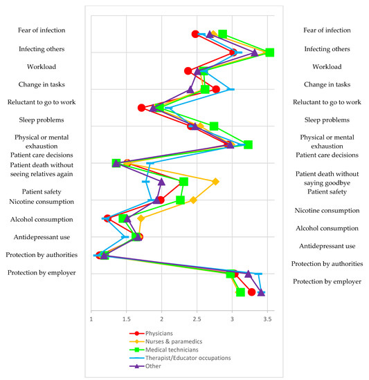 The comparison of occupational groups shows that therapeutic and educational professions (N = 1601, 21.2%) were stressed the most by changes in professional tasks (item 4) (M = 2.98, SD = 1.32). The fear of infecting themselves or others was lowest (M1 = 2.48, SD1 = 1.22; M2 = 3.02, SD2 =1.34) among physicians (N = 1906, 25.3%) and highest among nurses and paramedics (M1 = 2.73, SD1 = 1.30; M2 = 3.49, SD2 =1.34) as well as medical technicians (M1 = 2.86, SD1 = 1.24, M2 = 3.53, SD2 =1.30). Physicians (M7 = 1.72, SD7 = 1.02) were the least likely to feel reluctant about going to work. Medical technicians (N = 1727, 22.9%) were the most likely to report mental or physical exhaustion (M9 = 3.23, SD9 = 1.27). Compared to other professions, nurses and paramedics (N = 1422, 18.9%) experienced the most stress caused with the thought that patients might die without seeing relatives again (M11 = 2.76, SD11 = 1.45), while therapeutic and educational professions experienced the least (M11 = 1.78, SD11 = 1.24). In addition, nurses and paramedics (M13 = 1.71, SD13 = 1.29) reported the greatest increase in nicotine use, while antidepressant use was largely the same among the different professions (M15 = (1.08; 1.19)), and only the therapeutic and educational professions reported a lower/slight increase in alcohol use (M14 = 1.48, SD14 = 0.94). The differences in the various problem areas and protective factors are shown in Figure 1. The specified differences between the groups were statistically significant across all items (see Table 4).
