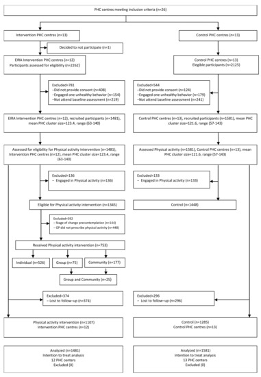 A total of 3062 participants from the 25 PHC centers met the eligibility criteria. The IG had 1481 participants, and we classified 1345 of them (90.8%) as inactive, based on the Brief Physical Activity Assessment Tool. Of these, 502 participants smoked, 1248 consumed an unhealthy diet, and 405 were at risk for the three unhealthy behaviors. Of the 1345 participants classified as inactive, 753 (56.0%) received the PA intervention depending on the personal stage of change. Of these 753 participants, 526 received individualized interventions, 75 participated in group sessions, and 177 were prescribed community activities. The CG had 1581 participants, with 1448 (91.6%) classified as inactive; these individuals were managed according to the usual care practice established in each health center. Among the 1448 inactive participants in the CG, 564 were smokers, 1349 consumed an unhealthy diet, and 465 followed all three unhealthy behaviors. Twelve months later (at the end of the study), 374 participants in the IG (25%) and 296 in the CG (19%) were lost to follow-up.
