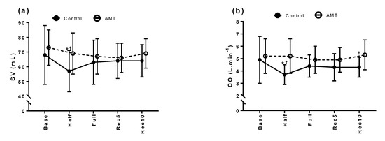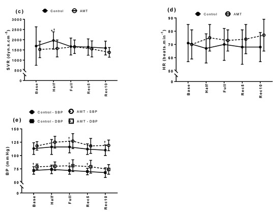 (a) Stroke volume (SV), (b) cardiac output (CO), (c) systemic vascular resistance (SVR), (d) heart rate (HR) and (e) systolic and diastolic blood pressure (SBP and DBP) during blood donation for control and AMT groups. Data points are presented as mean ± SD. Base = baseline; Half = 50% donated; Full = 100% donated; Rec5 = after 5 min in recovery; Rec10 = after 10 min in recovery. * denotes significant difference from baseline (p < 0.05) and † denotes significant difference between groups (p < 0.05).