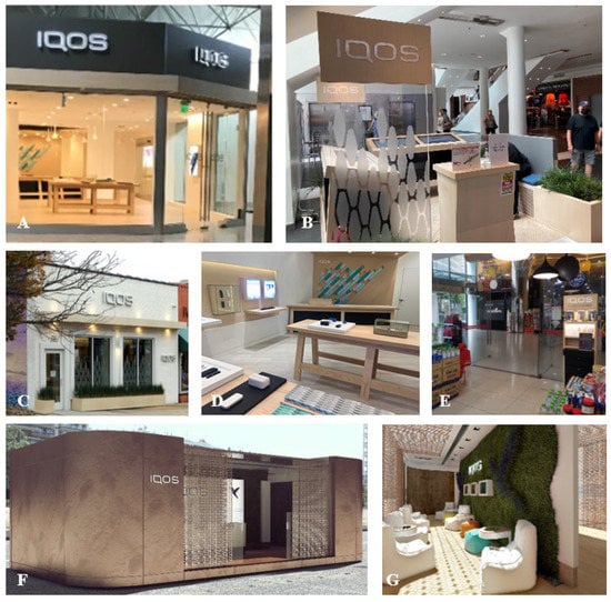 Types of IQOS points-of-sale. Notes: (A): Specialty Store, Lenox Mall, Atlanta, Georgia, US, Fall 2019 [37]; (B): Kiosk, Pentagon City Mall, Arlington, Virginia, US, Summer 2021 (photo by authors); (C,D): Specialty Store, Richmond, Virginia, US, Spring 2021 (photo by authors); (E): Corner, Kuala Lumpur, Malaysia, Fall 2019 [49]; (F,G): Pop-up, Thessaloniki, Greece, Summer 2018 [50].