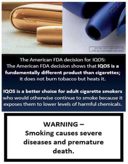 In order to stay in or enter the US market, manufacturers are required to submit a Premarket Tobacco Product Application (PMTA) to the Food and Drug Administration (FDA) for any new tobacco product (or modification of products) commercially marketed after February 2007, which also includes e-cigarettes [1]. Manufacturers can also apply for the Modified Risk Tobacco Product (MRTP) category, which, if approved, would grant authorization to use “reduced risk” or “reduced exposure” messaging in their marketing [2]. Among new tobacco products emerging and expanding globally [3,4,5,6] are heated tobacco products (HTPs; electronic tobacco products that heat tobacco), which have shown dramatic increases in use and consumer interest [7,8]. This paper focuses on the global HTP leader IQOS by Phillip Morris (PM) [9]; IQOS was first released in Japan in 2014 and is now sold in >60 countries and has >17 million users [10].