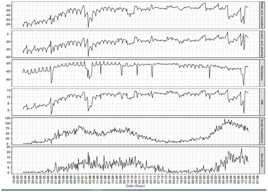 Time series of the studied community mobility reports (CMRs), community mobility index (CMI), hospitalisation and deaths from COVID-19, Oman, 1 April 2020 to 22 May 2021.