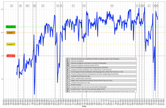 The NPIs, mainly movement restriction measures, were plotted against the CMI levels, as shown in Figure 2. Assigning the baseline at 10.5, we labelled the remaining levels of CMI to capture the different strategies of movement restriction. Apart from weekends and public holidays, level 1 (CMI at 10) was reached in (E), which was a one-week curfew from 9 p.m. to 7 a.m. and (G), which was a two-week curfew from 8 p.m. to 5 a.m. Level 3 (CMI at 8) was reached with the Muscat (the capital of Oman) lockdown during the month of Ramadan and the Eid holiday in May 2020, (B). In addition, level 3 was reached during lockdown in all governorates with a two-week curfew from 7 p.m. to 6 a.m. (D) and during the one-week curfew from 7 p.m. to 4 a.m. during Eid (M) in May 2021. To investigate the gradient effects of the CMI on COVID-19 numbers of admissions and mortality, we introduced level 2 at a CMI of 9. This level was reached during the 9 p.m. to 5 a.m. curfew for the entire month of Ramadan 2021 (L).