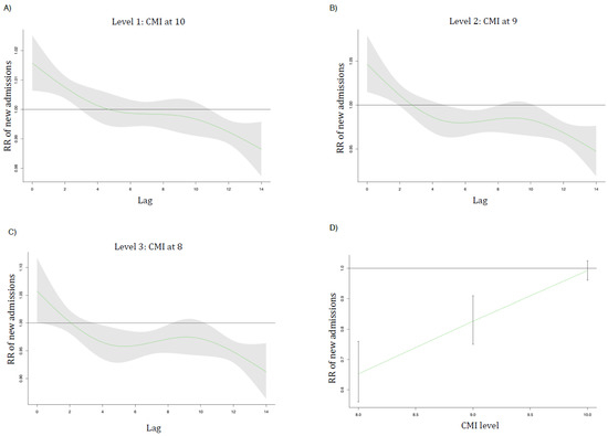 The lag curves (in days) representing the relative risk (RR) of new admissions with a shaded 95% CI for each future day following a decrease in CMI at level 1 (A), level 2 (B), and level 3 (C). (D) represents the overall reduction in hospitalization with each level of CMI. Level 1 is CMI = 10, level 2 is CMI = 9, and level 3 is CMI = 8.