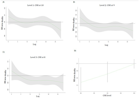 Figure 3 and Figure 4 show the lag curves (in days) representing the association between admissions/deaths relative risk (RR) with a shaded 95% CI for each future day following a decrease in CMI at level 1 (A), level 2 (B), and level 3 (C). In (D), the overall reduction in admissions/deaths for each level of CMI is presented.