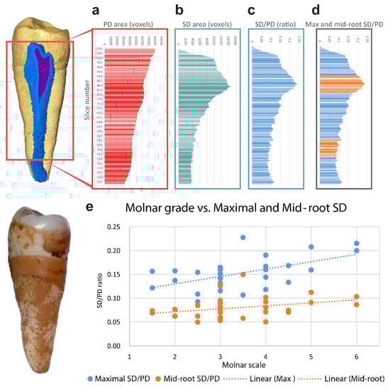 SD and PD evaluation of horizontal slices. Representative image of 30 teeth examined, isosurface of a tooth with a three-dimensional representation of the SD layer (blue) on top of the pulp (purple) and original tooth below. (a) PD area in voxels (red) for each slice from the first slice with SD to the bottom third of the tooth. (b) SD area (green) for each voxel slice. (c) SD/PD ratio (blue) for each slice. (d) Max and mid-root SD/PD ratios. There are 100 maximal (upper) and 100 mid-root slices (lower) demarcated in orange. (e) SD/PD values of maximal (blue) and mid-root (orange) measurements, partitioned by attrition levels (r = 0.577 * and r = 0.331 accordingly, Spearman’s correlation) * p < 0.05, n = 30.
