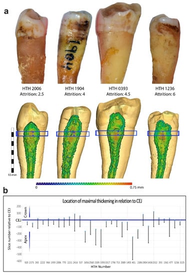 The effect of attrition on SD formation was analyzed for the first time using a three-dimensional display of the SD architecture. By examining a homogeneous group of ages, we could eliminate the age factor, which is a crucial confounding variable that affects SD formation. Using a same-sex group, another possible confounder was negated, even though previous work suggests that SD formation is not affected by sex, and that gender is not a considerable confounder [,,,]. Segmented SD was evaluated using two-dimensional measurements at each horizontal slice and three-dimensional thickness maps; both showed a similar pattern of SD thickening below the CEJ. This pattern was evident in the vast majority of the teeth, regardless of the attrition level. However, the amount of thickening (SD/PD ratio) correlated with higher attrition levels.