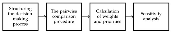 The AHP is one of the best known and the most often used multi-criteria decision-making methods. The author of the AHP is Prof Thomas Saaty. The overall AHP process consists of four steps, shown as a workflow in Figure 2 [26,27]: