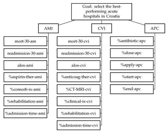 The hierarchical structure of the problem, using abbreviations from Table 1 is presented in Figure 4. At the top of the hierarchy is the decision-making goal: identification of the best-performing hospitals in Croatia. At the lower level, there are entities as the main criteria. Finally, at the second level, there are the subcriteria, criteria derived from the indicators presented in Table 1.