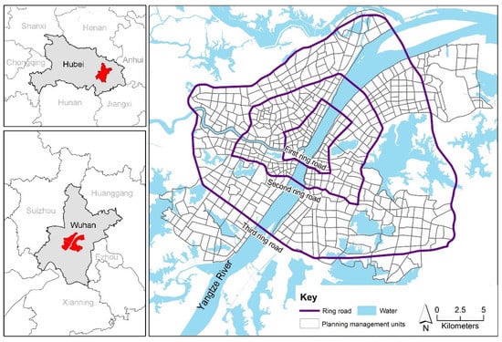 Wuhan is the capital of Hubei province (113°41′–115°05′ E, 29°58′–31°22′ N) and is one of the largest cities in China. Specifically, the core area of Wuhan city was selected as the study area, containing 589 planning management units with an administrative area of 522.68 km2 (Figure 1).