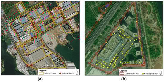 Industrial area (a) and commercial area (b) boundary derived from the land use map and industrial POI derived from Sina Weibo.