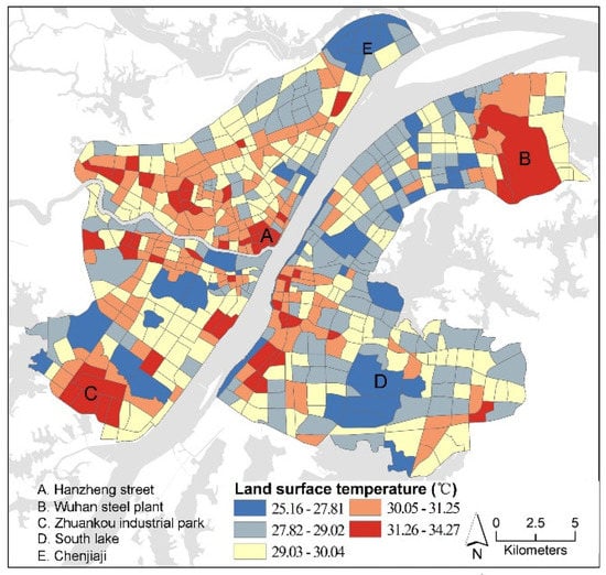 The spatial distribution patterns of LSTs are shown in Figure 3. The planning management units were classified according to the average LST. Then, the natural breakpoint method was employed to classify the 589 management units into five categories. The average LST and variance of each category of planning management units are shown in Table 2. It can be observed that the planning management unit with the highest LST is located in the Zhuankou industrial park, which is characterized by concentrated contiguous industrial areas, and reached an LST of 34.27 °C, whereas the management unit with the lowest LST is located around South Lake, with an LST of 25.16 °C. In general, the LST is relatively higher in the core area in relation to the suburb area. In addition to the industrial areas, the high LSTs are more likely located in the central areas, such as Hanzheng Street which contains dense construction areas. Industrial areas in the suburbs also show high LSTs, such as the Wuhan Steel Plant and the Zhuankou Industrial Park, whereas the areas with abundant water and vegetation, such as South Lake and Chenjiaji, have the lowest LST (see Figure 3).