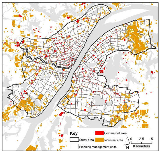 Land use types can be delineated by their spectral and structural features extracted from high-resolution remote sensing images and also by their socioeconomic functions derived from geographic information data [54]. First, traffic networks were applied to divide the blocks. The traffic networks divide a city region into subregions and also block the heat circulation on the surface of a city [55]. Second, the land use types of each block were preliminarily identified according to the land use map (2014) in vector version acquired from the Wuhan Natural Resources and Planning Bureau. The land use map database was set up according to artificial field surveying, considering the overall information of the business registration and cadastral land map, which closely reflected the main activities within each block. Third, we extracted POIs and determined the dominant function of the blocks (Figure 2). The functional intensities of the different POI types were normalized using kernel density estimation. The kernel density analysis was implemented using a quadratic kernel function with a search radius of 500 m [56]. The regions with relatively higher POI point density values indicated the dominant function of the blocks. Four, according to the land use type controversies between the land use map and POI data, we selected the blocks to be corrected. In detail, by comparing the land use types and the dominant functions derived from the land use map and POI data, respectively, we determined the target blocks with land use types that may have been misidentified by the land use map. Five, with the aid of visual interpretation based on high-resolution satellite images (the Google Earth images) and our survey of the study area, we artificially determined the actual and relative land use types of the blocks [57]. The POI data were obtained from the Resource and Environment Science and Data Center (https://www.resdc.cn/data.aspx?DATAID=341) (accessed on: 3 September 2015), and were originally derived from Autonavi. Among the 22 first-level classifications of the POI data, we extracted several types of POI data in relation to industrial and commercial functions. Furthermore, we extracted industrial and commercial areas from the land use type dataset, which probably discharged more anthropogenic heat according to previous studies in the literature. In order to verify the land use type of the blocks with different types of POIs, first, we compared the number of different types of POIs. Then, for the condition that the number of different types of the POIs was even within a block, we further investigated the names of the companies, which could be derived from POI data, to determine the actual and relative primary functions of the blocks. According to the land use map data obtained from the Wuhan Natural Resources and Planning Bureau, 64.33% of the 6325.78 ha of industrial area in the study area belong to the "third manufacturing” (M3) category. The definition of this type of industrial area is an industrial area which could seriously interfere with a surrounding residential area and public environment. Therefore, it is suggested that the industrial area contained light industries and “boiler” industries in the study area.