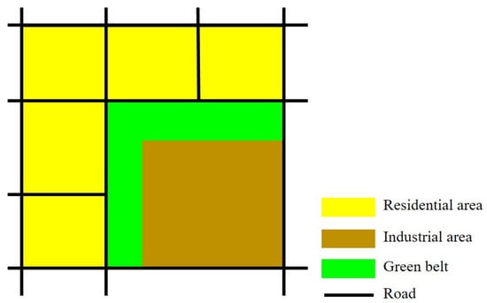 On the basis of the above correlation analysis of PIA, PCA, and LST, we propose some planning strategies to optimize the spatial layout of industrial and commercial functions that are aimed at mitigating the UHI effect. Since there is a significant positive correlation between PIA and LST, the layout of industrial areas adjacent to residential areas and various public facilities should be avoided in order to prevent the adverse effect on residential areas of high-temperature airflow formed by industrial production. Green belts should be set up between industrial areas and other functional spaces for existing cases where industrial areas are adjacent to residential areas and public facilities (Figure 5). The green belts could help to efficiently block the disorderly diffusion of high-temperature airflow generated in industrial areas and to prevent the surrounding urban functions from being heated.