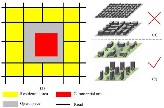 Planning strategies for the spatial layout of a commercial area: (a) The ideal special relationships between a commercial area and a traditional residential area, an open space is located between them; (b) traditional residential area, which is similar to LCZ 2 (compact mid-rise) and LCZ 3 (compact low-rise); (c) optimized residential area, which is similar to LCZ 4 (open high-rise) and LCZ 4 (open mid-rise).