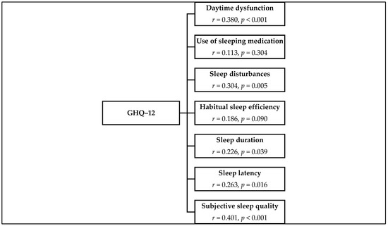 The global GHQ-12 score correlated significantly positively with the global PSQI score (r = 0.414, p < 0.001). Apart from the components use of sleeping medication and sleep efficiency the PSQI component scores had significant positive correlations with the GHQ-12 score. The results are shown in Figure 1.