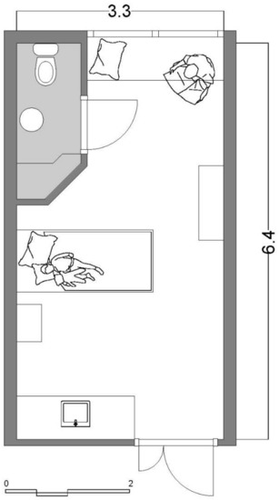 Average patient room typology of the observed hospitals. Net m2: 18.8 m2 patient room and 2.4 m2 bathroom.