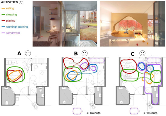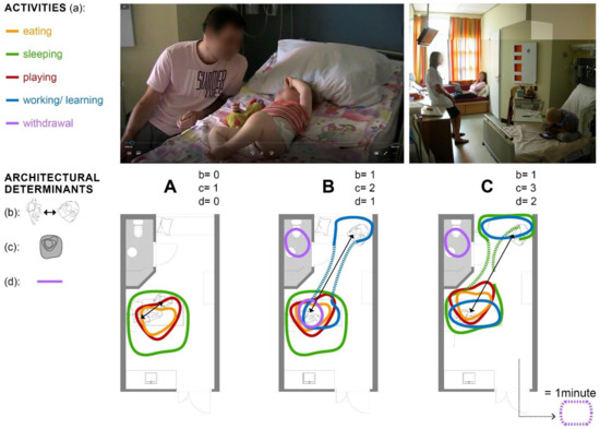 With a minimal exception of half an hour per day, parents and the child reside together in their room 24/7 (e). Analysis of the behavioral observations shows that the patient room is used for the entire daily routine of parent and child and all related functions—namely, (a) eating, sleeping, playing, learning (child), working (parent), and withdrawing. The place where these functional activities occur varies from time to time. Figure 2 shows that analysis of behavioral observation generally reveals three situations ((A), (B), (C)) that differ in three architectural determinants ((b), (c), (d)): the distance between parent and child (b), the space used for interaction (c), and the used means of withdrawal (d). For the analysis of the relationship between interaction and architectural determinants, the functions observed as outcomes (a) (eating, sleeping, etc.) are considered in relation to the use of space by parents and children. In order to better distinguish the individual functions, they are each given a different colored line in Figure 2 and are referred to as “activities”. Analysis reveals that in situation (A), within a day, only the activities of eating, sleeping, and playing occur. All activities are performed through the interaction between parent and child. There is no real spatial distance, but the child’s bed is the central place of action and even residence for both persons. In situation (B), the activities of learning or working, and withdrawing additionally occur, without leaving the patient room. The parent maintains a greater distance from the child, and the only spatial withdrawal occurs in the room-integrated bathroom. Only in situation (C), it can be observed that parent and child work and learn separately and that the parent sleeps on a separate bed. Only in this situation, the physical contact with the child is reduced to a minimum, and the parent leaves the room several times a day for a few minutes.