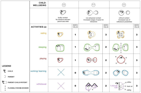 Figure 3 graphically depicts the relationship between child well-being and architectural determinants. The detailed analysis of the behavioral observation shows that all daily activities reveal the correlation. The better the child’s health is according to the parents’ assessment, the further they move away from the child’s bedside. Interactions become fewer but the space that is used for it increases. Activities such as sleeping, learning, working, and eating occur in separate places within the room and sight. In some cases, room dividers such as self-made paravents are used to reinforce the spatial separation and thus the feeling of privacy. If the child is very well according to the parents’ estimation, they even leave the room for a few minutes several times a day.