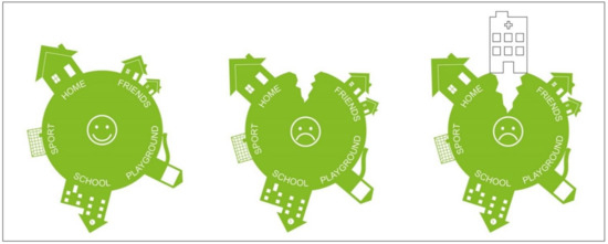 This result explains that despite the observed tendency of parents to withdraw when the child is better, there is no decrease in their anxiety and stress levels. Numerous studies have already documented the high stress levels of parents, who were hospitalized in these kinds of outdated rooms [58,88]. One-third of them even developed post-traumatic stress disorder [16]. Furthermore, Franck et al. showed that housing families outside the hospital have advantages over rooming-in in terms of parental well-being [89]. Unlike in this study, the parents in our study are not willing to leave the room for more than a few minutes. The observed unwillingness to leave the room for longer periods of time confirms the constant emotional alertness of the parents, which explains the constant fear and tension. We have previously described this phenomenon as the parent–child patient [76,90]. Figure 4 describes the emergence of this parent–child patient: When children become seriously or life-threateningly ill, their safe world is suddenly “cracked”, and illness becomes the focus of their life. Rodriguez et al. [91] asked 106 children with cancer and their parents to report on cancer-related stressors for the child near the time of diagnosis: Daily role stressors included missing school days or falling behind in schoolwork, not being able to accomplish the things they used to, having to go to the hospital or clinic visits, and concerns about family and friends. The stressors related to cancer treatment involved feeling sick or nauseous from treatments, concerns about changes in appearance, and pain and soreness from medical procedures. Uncertainty about cancer included stress related to not understanding what doctors discuss about cancer, feeling confused about what cancer is and its causes, and concerns about the future. Based on both children’s and parents’ reports, all three types of stress were experienced as moderately to highly stressful and with relatively high frequency for children [91].