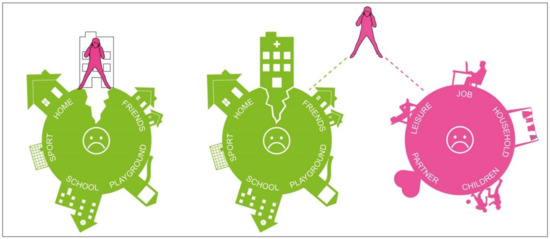 If children are admitted to the hospital, the crack becomes larger, since the known living environment—the child’s normality—is suddenly reduced to that of the hospital. Moreover, this environment is initially associated primarily with pain, fear, and illness. In order to adapt to this environment, the parent admitted to the hospital acts as a “healing bridge”, shown in Figure 5. While studies have already shown that this “healing bridge” is successful and that the co-admission of the parents leads to a reduction in the children’s anxiety and psychological stress, the parents have little opportunity to reduce their own anxiety and stress. On the contrary, in addition to life in the hospital, home life must also be mastered. Partnership, family, job, and siblings place additional demands that lead to the so-called parenting balancing act during this time [76,88]. Each phase of a chronic illness can present children and their families with significant challenges and stressors. However, there is evidence that chronic conditions may exert greater psychological and physical stress than acute illnesses that resolve quickly [92]. This is consistent with more general models of the adverse effects of chronic stress as a consequence of processes of allostatic load that include the physical and psychological wear and tear associated with prolonged or repeated demands that characterize chronic stress [93]. In a recent study of parents residing in a Ronald McDonald House during their child’s hospitalization, family functioning mediated the relationship between family hardiness and caregiver anxiety, with both family functioning and hardiness reducing anxiety during the hospitalization [20]. Distance from the hospital has also been shown to affect family function when children have chronic conditions [94].