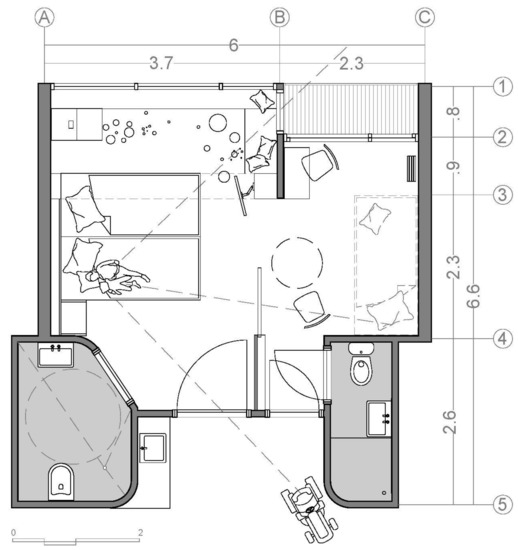 In 2010, the initiators of the Princess Maxima Center for Pediatric Oncology (PMC)—formerly known as the National Child Oncology Center (NKOC)—commissioned the development of design criteria that address these special needs of children with cancer and their co-admitted parents. The research and development project resulted in a novel patient room typology: the Parent–Child Patient Unit (PCPU) [76]. The PMC opened its doors in 2018 in Utrecht, The Netherlands. The PCPU has the following design criteria [76], which are graphically shown in Figure 6: