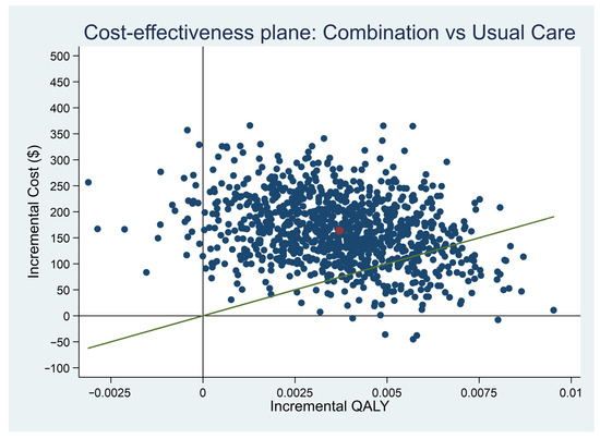 Cost–Effectiveness Plane (healthcare payer perspective). Red dot: Incremental cost-effectiveness ratio, Green line: willingness-to-pay threshold.