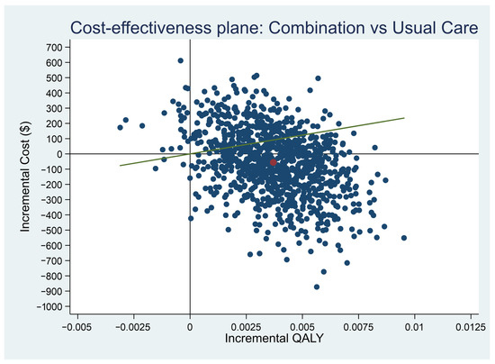 In contrast, from the societal perspective, the majority of paired dots after bootstrapping 1000 times, were scattered below the threshold value. The ICER (red dot) was also located in the south-east quadrant in Figure 2. This indicated CMT+UC was less costly and more effective (i.e., better quality of life) in the simulated cost-effectiveness plane, compared with usual care only.