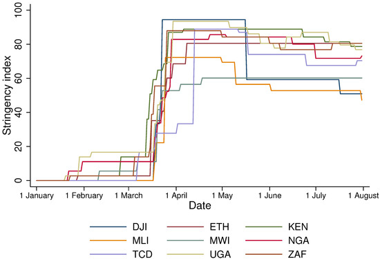 Figure 1. The data suggest that the stringency of the government responses reached their peaks during March and April, with only Djibouti and Mali relaxing the restrictions relatively early at the end of July. In August 2020, most of the sample countries continued to impose considerable restrictions. While the severity of government restriction could affect food insecurity, sub-national level data on these restrictions are not available, and, as a result, government restrictions could not be included in our econometric analysis.