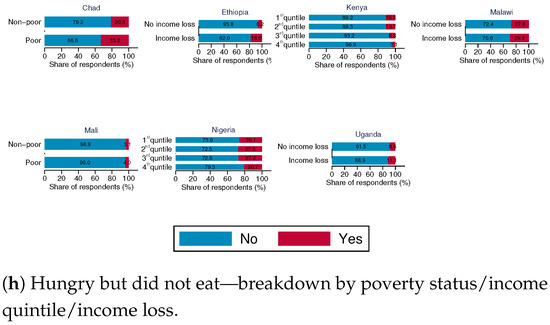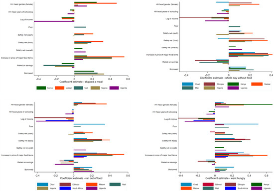 46] found poverty, environmental stressors, and conflict to be the most important drivers of food insecurity. That poverty has been found to be closely linked to food insecurity, both in our analysis and in earlier literature, is perhaps not surprising. However, what is particularly interesting in our results is that the link between income and food insecurity appears to differ considerably among countries, with the effects in Chad, Ethiopia, and Uganda being particularly large. We have econometric evidence that households that were able to rely on their savings during the pandemic had a lower probability of suffering from food insecurity. This is supported by the fact that poorer households have suffered an income loss during the pandemic, and those in the lower-income quartiles are also more likely to suffer from food insecurity.