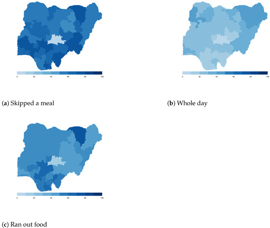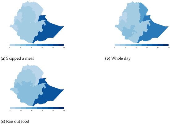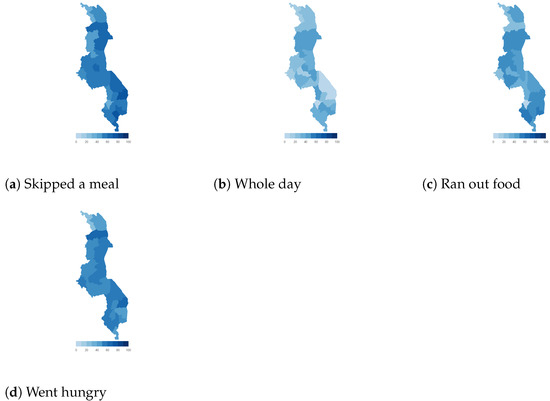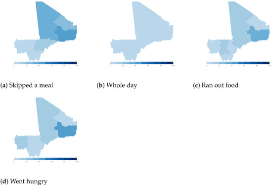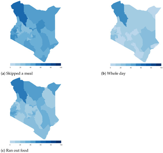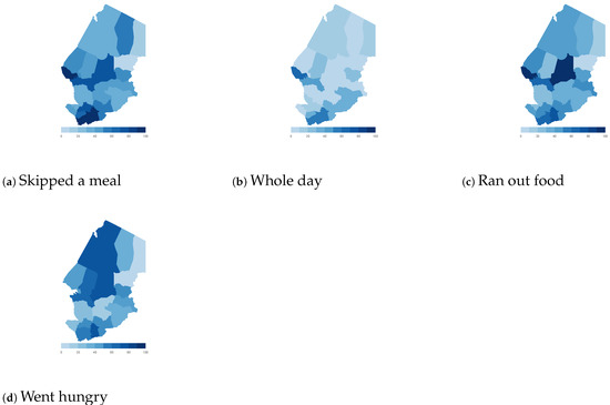 Finally, we map the responses for each of the food insecurity indicators aggregated at the sub-national level. These maps (
