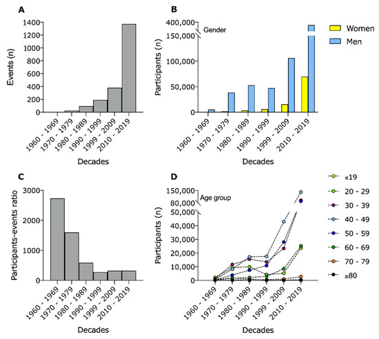 The total sample comprehended data from 2067 events, from 1960 to 2019, and was clustered by decades. The number of events was found to be significantly higher (>35.0%) in the last decade (2010–2019), growing from 379 in 2000–2009, to 1373 (Figure 1A). The number of participants also had an exponential increase in the last decade in both men (34.3%) and women (44.9%), with 369,969 men and 69,668 women enrolling in 100-km ultra-marathons between 2010 and 2019 (Figure 1B). The ratio of participants/event significantly decreased from 1960 to 1989, reaching a plateau of 320 participants per event from 2000 to 2019 (Figure 1C). All age groups showed an increased participation throughout the years, but those with more participants from 2000 to 2019 were aged between 30- and 59-years-old (Figure 1D). Interestingly, participants with 80 or more years of age have increased their participation from zero, in the first decade, to 100 in 2010–2019.