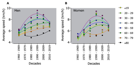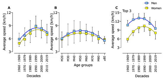 The Shapiro-Wilk and Levene’s tests were applied for normality and homogeneity, respectively. General linear models were as follows: average speed (three-way analysis of variance (ANOVA)) and sex × decade × age group, and average running speed considering only the top three athletes per event (two-way ANOVA) and sex × decade. Sex was always included as a fixed factor, and decade and age group were included as random factors. Partial eta square (pη2) was calculated for each model and used as a measure of effect size considering small ≥ 0.01, medium ≥ 0.06, and large ≥ 0.14. When interactions were found (p < 0.05), pairwise comparisons were applied to identify the differences more accurately. The Mauchly test verified the hypothesis of sphericity, and when violated, the degrees of freedom were corrected by the Greenhouse–Geisser estimates. An independent t-test was used to test the difference of age between sex, considering only the top three athletes. Significance level was set at 5% (p < 0.05). All statistical procedures were performed using the Statistical Package for the Social Sciences (SPSS version 26. IMB, Armonk, NY, USA) and GraphPad Prism (version 8.4.2. GraphPad Software LLC, San Diego, CA, USA).