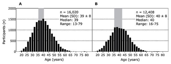 Histogram of top three athletes distributed by their age (participants × age). (A) men, (B) women.