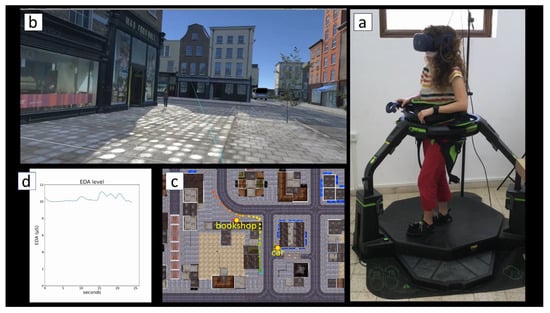 Self-reports—Probably the most common method for recording participants’ personal experiences and behaviors, self-reports provide researchers with a simple way to record relevant introspective data about preferences, experiences and wellbeing. However, while there is much information on best practices of implementing and analyzing self-reports, the method is often criticized for being easily biased due to wording, order of questions and other factors related to the design of the questionnaire and characteristics of participants [64]. Researchers use self-reports in IVEs in the form of a simple questionnaire or as part of a stated preferences experiment in which participants rank, rate or choose their preferred option from a set of available alternatives [48,62,63]. Importantly, IVE studies facilitate a variety of options for triggering questionnaires based on location, time and other events that occur (e.g., when a change in participants’ behavior, such as their walking speed, is detected). This makes it possible to ask questions at very precise moments. Self-reporting can also take place before or after the IVE experiment episode using a more traditional questionnaire [47,49]; however, questions prompted in situ may make it possible to overcome typical recall biases, which is important in studies about momentary experiences and wellbeing.