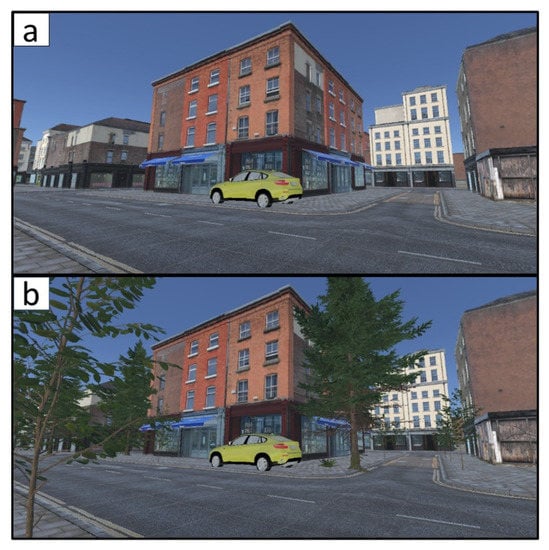 A 2-D view of the immersive virtual environment (IVE) extracted from near the starting point of the experiment. (a) control condition (no greenery); (b) green condition. The two environments are identical other than green elements that were used in the second environment. Pupil fixation on the yellow car that appears in the images was recorded using the VR headset’s eye-tracking sensor.