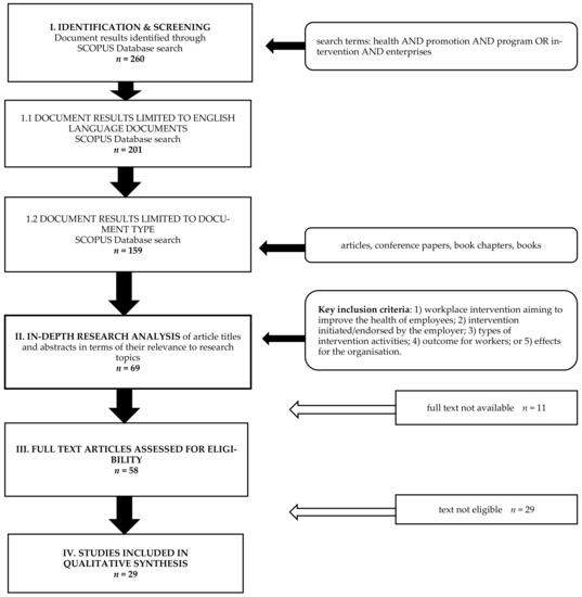 The scientific literature focusing on health promotion interventions and programs in enterprises and outcomes for employers and employees published in English between 2000 and March 2020 was systematically searched in the SCOPUS database [57], which has been selected to access research from different countries in a number of areas, in particular including peer-reviewed publications from the fields of medicine, health, business, management, and social sciences. A diagram of the research procedure and systematic literature review is presented in Figure 1. The sampling procedure for the study consisted of four stages: (1) Identification and screening (in Scopus), (2) in-depth research analysis of article titles and abstracts in terms of their relevance to research topics, (3) an analysis of the availability of full texts, and (4) an in-depth qualitative analysis of full texts [58]. In order to ensure the accuracy and consistency of the obtained data and the reliability of drawing conclusions from the analyzed studies, two scientists were independently engaged in all stages of the process.