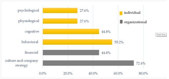 As regards individual outcomes of WHPIs, the studies most often reported behavioral (55.2%) results, which referred to leading to changes in the behavior of employees towards a healthier lifestyle, helping them to adopt and maintain healthy behaviors (sleep, exercising, a healthy diet, coping with stress), and the reduction of health risk behaviors (e.g., smoking). Approximately 45% of the investigated studies reported cognitive outcomes focused on changes in the beliefs, knowledge, and skills of employees. Less frequently, physiological (27.6%) and psychological (27.6%) outcomes were indicated in previous studies.