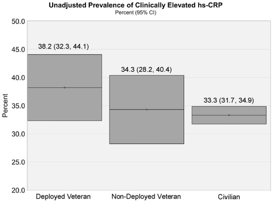 Mean hs-CRP levels were 4.06 mg/L for deployed veterans, 4.03 mg/L for non-deployed veterans, and 3.87 mg/L for civilians. The unadjusted prevalence of clinically elevated hs-CRP was 38.2% for deployed veterans, 34.3% for non-deployed veterans, and 33.3% for civilians (Figure 1).
