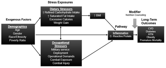 A healthier diet has the potential to interrupt this inflammatory pathway and improve the risk of CVD among the military population. In a prior study, obese individuals had statistically significant improvements in their hs-CRP profile with adherence to a low-calorie, Mediterranean-style diet [63]. Fruits, vegetables, and whole grain consumption were inversely associated with hs-CRP in a multi-ethnic adult study population [64]. On the contrary, the Western diet, characterized by excessive calories, high in saturated fat and refined carbohydrates, promotes a pro-inflammatory response and subsequently elevated hs-CRP levels [65,66,67]. In the military population, extended hours, rotating shifts, irregular mealtimes, and limited healthy food selections during mission training and deployment can expose military personnel to additional noncombat environmental stressors such as diet [68,69].