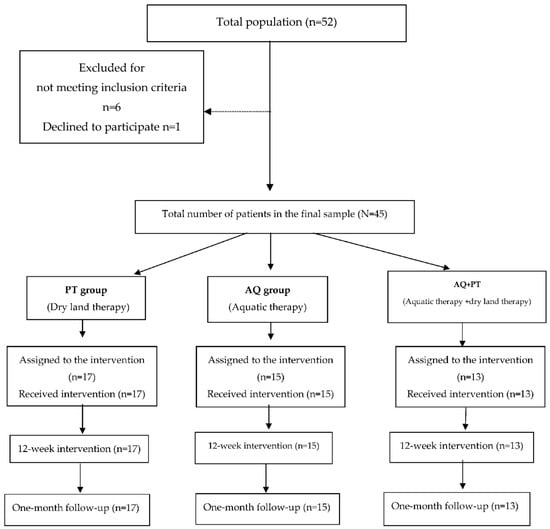 In total, 45 patients participated in the study, during a six-month recruitment period. According to the random allocation, 13 patients formed the combined group (AQ + PT group), 17 were part of the PT group (dry land therapy), whereas 15 were assigned to the AQ group (aquatic therapy). There were no significant differences in the demographic and clinical variables among groups. Figure 1 displays the selection and randomization process of patients assigned to the intervention groups.