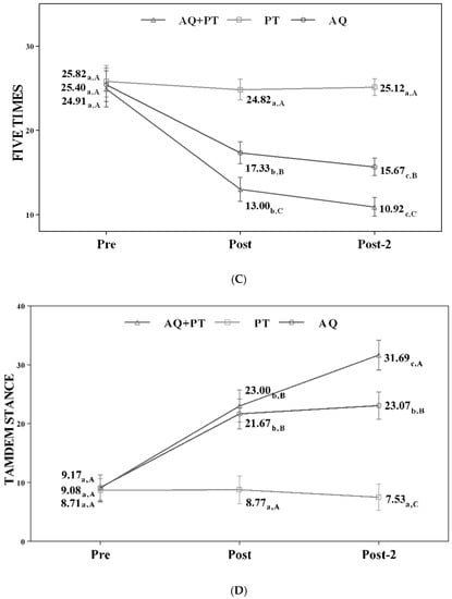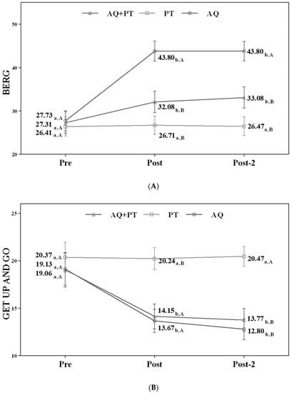 After twelve weeks of treatment, the scores for the Berg balance scale, the FTSTS, the tandem stance test, and the TUG test improved significantly for the AQ + PT group (p < 0.01). These improvements were significantly higher for the combined therapy group (AQ + PT group) compared to the PT group (p < 0.01), although improvements were also found in the assessments performed in the AQ group.