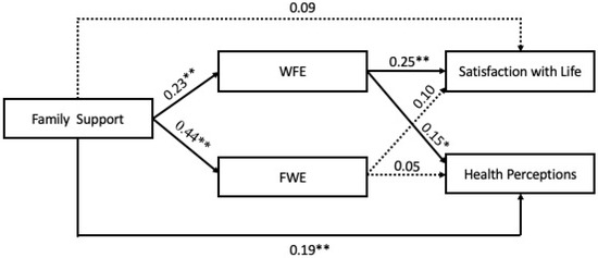 Concerning the relationship between FWE and the two dimensions of well-being, the expected positive relationships were not significant (with health perception—β = 0.05, n.s.—non-significant; satisfaction with life—β = 0.10, n.s.). However, as predicted, the relationships between WFE and both health perceptions (β = 0.15, p < 0.05) and satisfaction with life (β = 0.25, p < 0.01) were positive and significant.