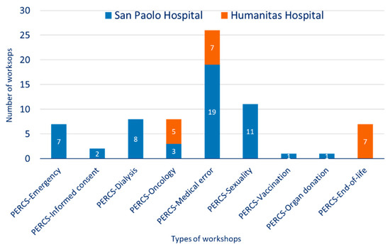 Between 2008–2020, 72 PERCS-Italy workshops were offered (52 at San Paolo Hospital; 20 at Humanitas University Hospital). Across the two settings, different PERCS workshops were offered, based upon the interests of the settings, including PERCS-Emergency Medicine (n = 7), PERCS-Dialysis (n = 8), PERCS-Oncology (n = 9), PERCS-Informed Consent (n = 2), PERCS-Medical Error (n = 26), PERCS-Sexuality (n = 11), PERCS-Organ Donation (n = 1), PERCS-Vaccination (n = 1), and PERCS-End of Life (n = 7). The different PERCS workshops offered in the two hospitals are depicted in Figure 1.