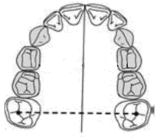 The intermolar diameter was measured as a linear distance between the central fossae of the right first molar and the left first molar of the upper maxilla (Figure 2).