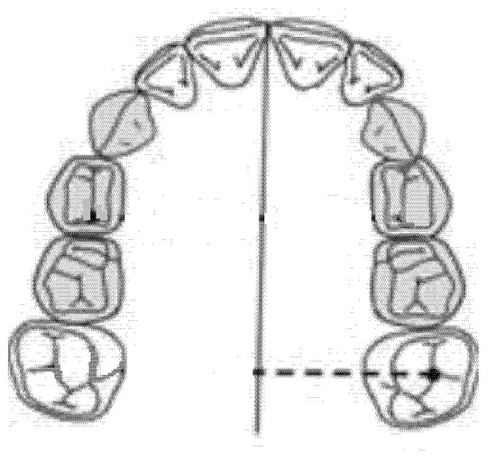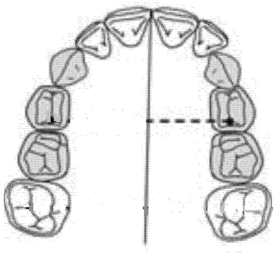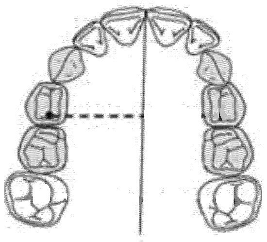 The inter-premolar diameter was measured as a linear distance between the central fossae of the right first premolar and the left first premolar of the upper maxilla (Figure 1).