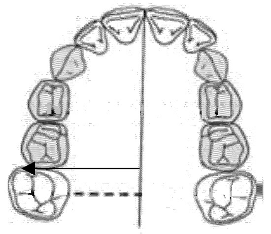 The diameter of the right posterior hemiarch was measured as a linear distance between the central fossa of the right first molar and the median palatine raphe of the upper maxilla (Figure 5).